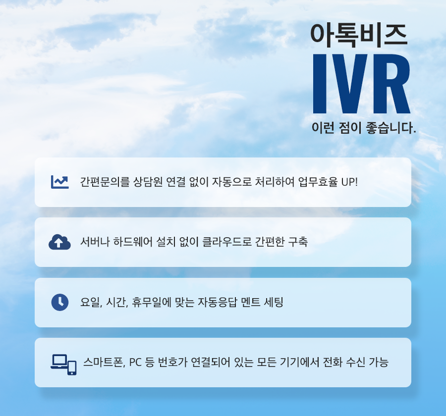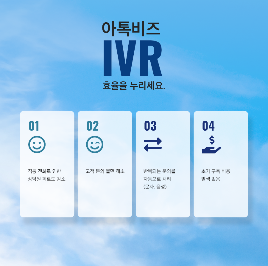 IVR시스템 내 원하는 문의 건의를 선택한 후 담당 상담원에게 연결되기 때문에 상담원이 직통 전화로 피로감이 쌓이지 않습니다. 또한 지속해서 반복되는 문의는 문자나 자동 음성으로 처리할 수 있답니다 :)