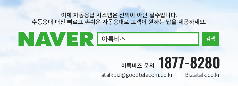 (주)굿텔레콤 | 주웅대 | 서울시 구로구 디지털로 288 대륭포스트타워1차 1306호 | 사업자 등록번호 : 120-86-47109 | TEL : 02-1877-8280 | Mail : atalkbiz@goodtelecom.co.kr | 통신판매신고번호 : 제2008-서울구로-0919호호 | 사이버몰의 이용약관 바로가기