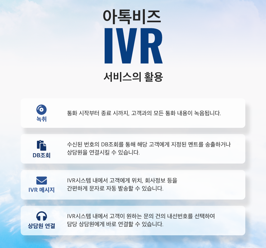 녹취와 DB조회, IVR메시지, 상담원 연결까지! 대화식 음성 응답 IVR시스템으로 고객 문의를 간편하게 해결 가능하답니다~ 고객은 빠르게 문의를 할 수 있고 상담원의 경우 업무의 효율을 높일 수 있습니다.