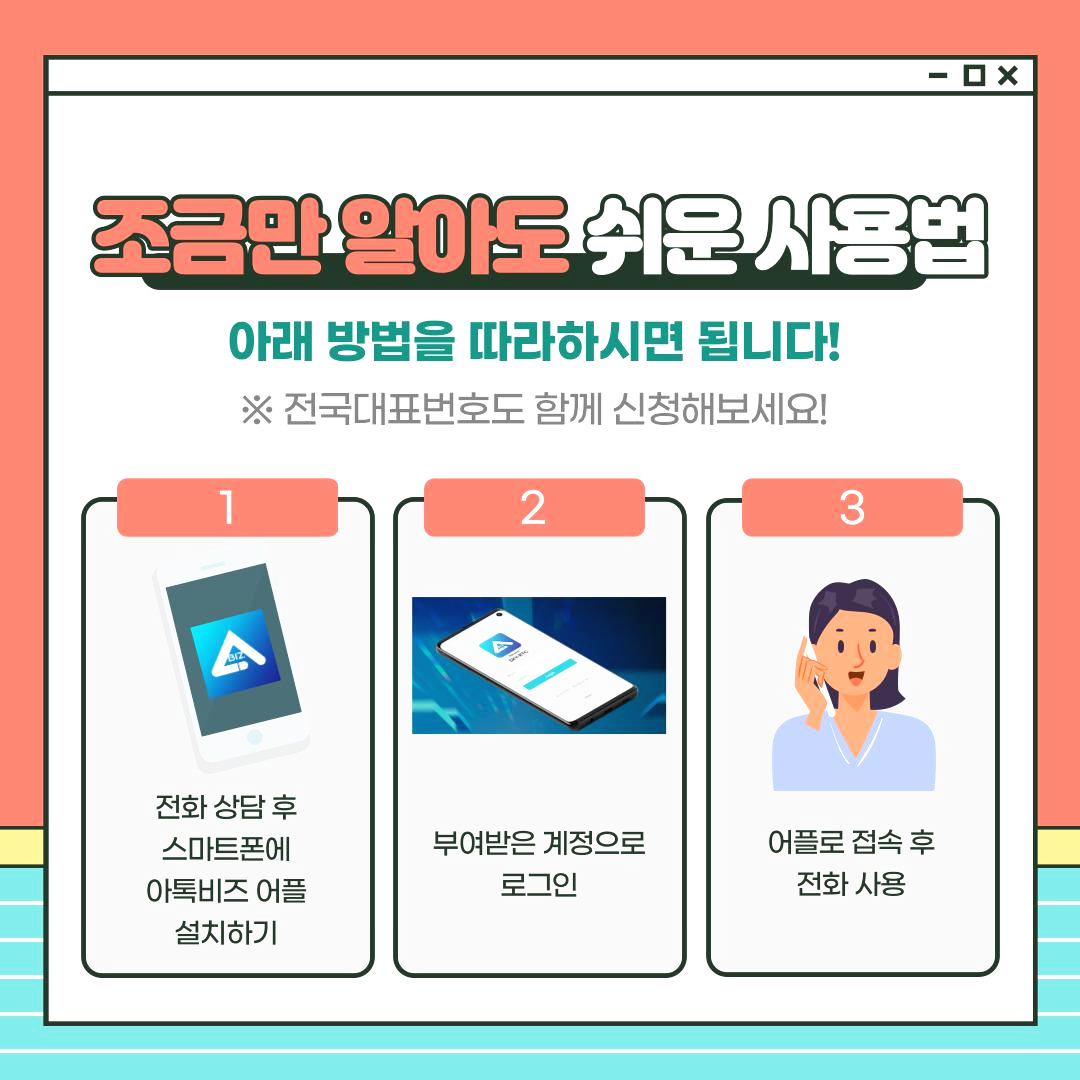 1. 아래 번호로 분양 전화 사용을 원한다는 상담을 진행하신 후, 개통이 완료되면 스마트폰에 아톡비즈 어플을 설치합니다.