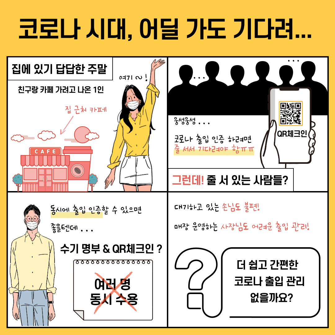 개인 정보가 노출될 위험이 있는 수기 명부, 스마트폰이 익숙하지 않은 중장년층에 어려운 QR체크인! 안심콜은 개인 정보 노출 걱정 없이, 남녀노수 누구나 쉽게 출입 인증을 할 수 있습니다.