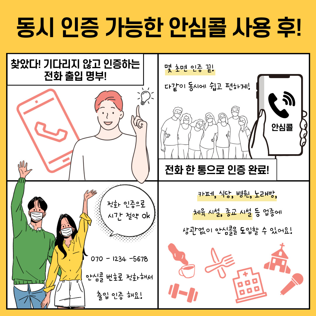 몇 초의 짧은 전화 한 통으로 인증이 완료되는 안심콜로 간단하면서도 꼼꼼하게 출입 관리를 해보세요.