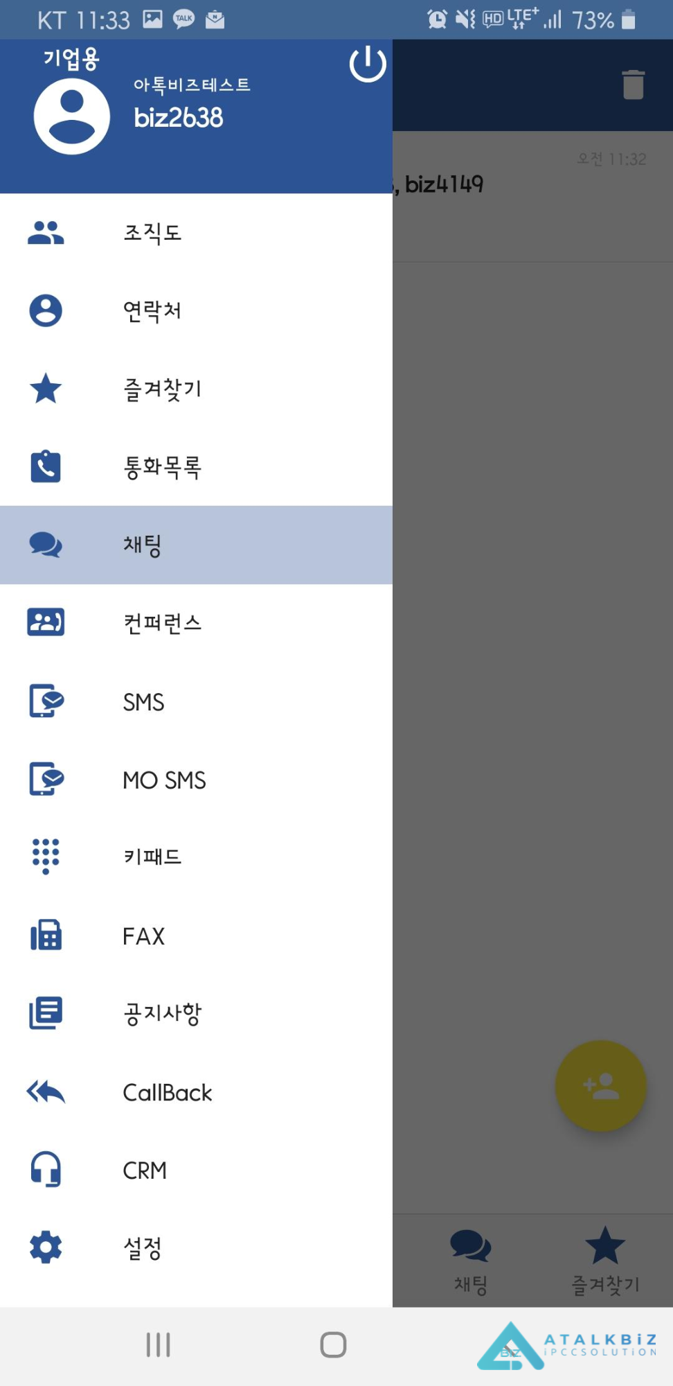 어느위치에서든 내선통화가 가능하며, 전화수신시 CRM에 등록되어있는 고객정보를 확인하여 수월한 상담을 진행하실 수 있습니다. 또한 조직도 / 연락처 / 즐겨찾기 / 통화목록 / 채팅 / 컨퍼런스 / SMS / MO / 키패드 / FAX / 공지사항 / 콜백 / CRM 등의 다양한 서비스를 아톡비즈 앱을 통해 손쉽게 이용하실 수 있습니다.