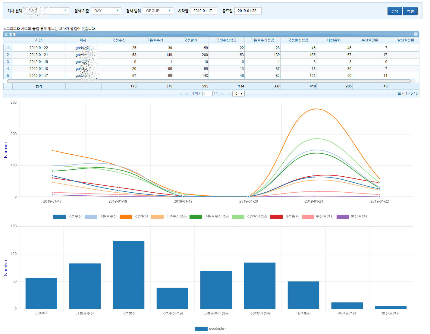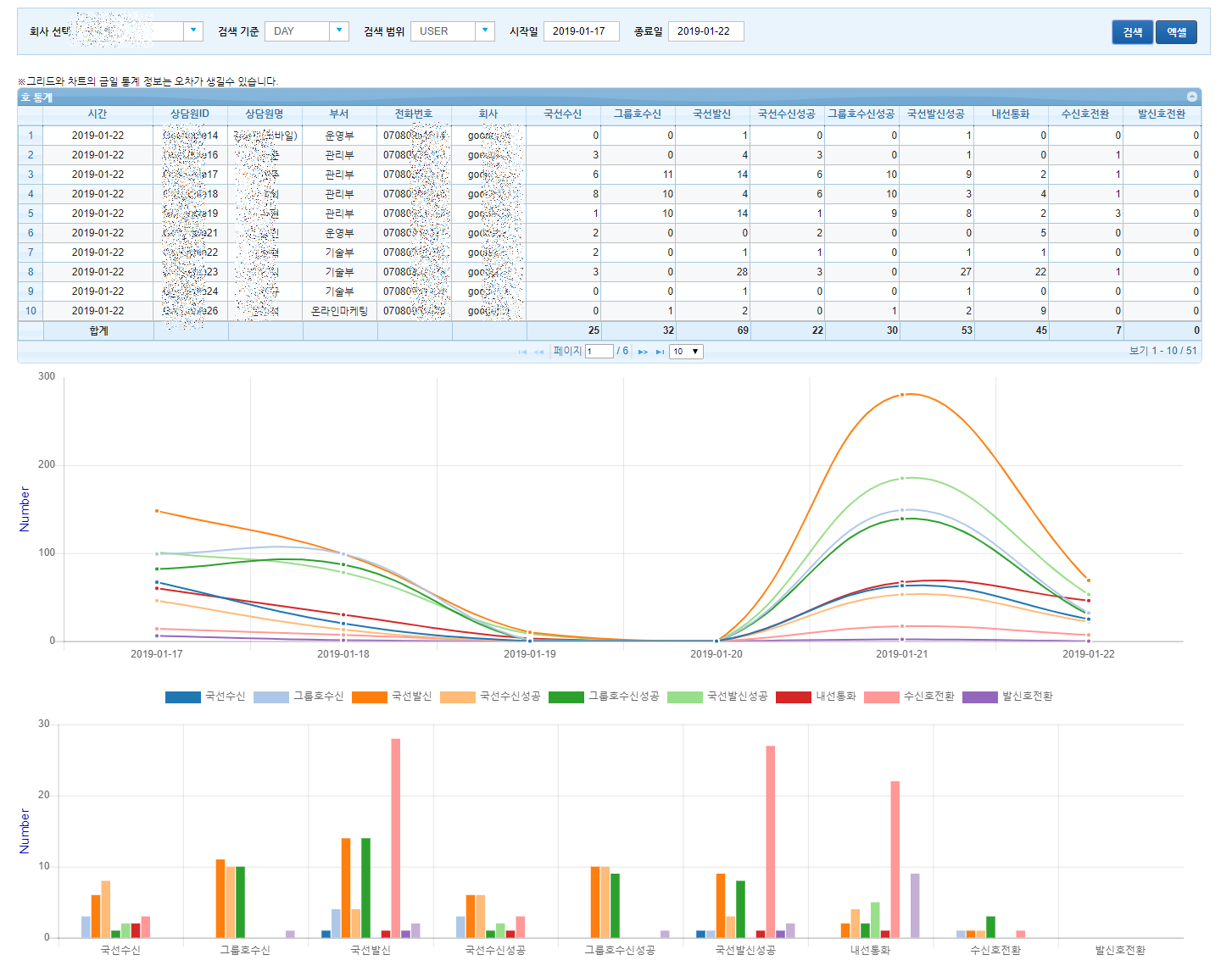 - 일별 회사로 수신, 발신, 내선, 돌려주기 부분이 알아보기 쉽게 카운팅 됩니다.