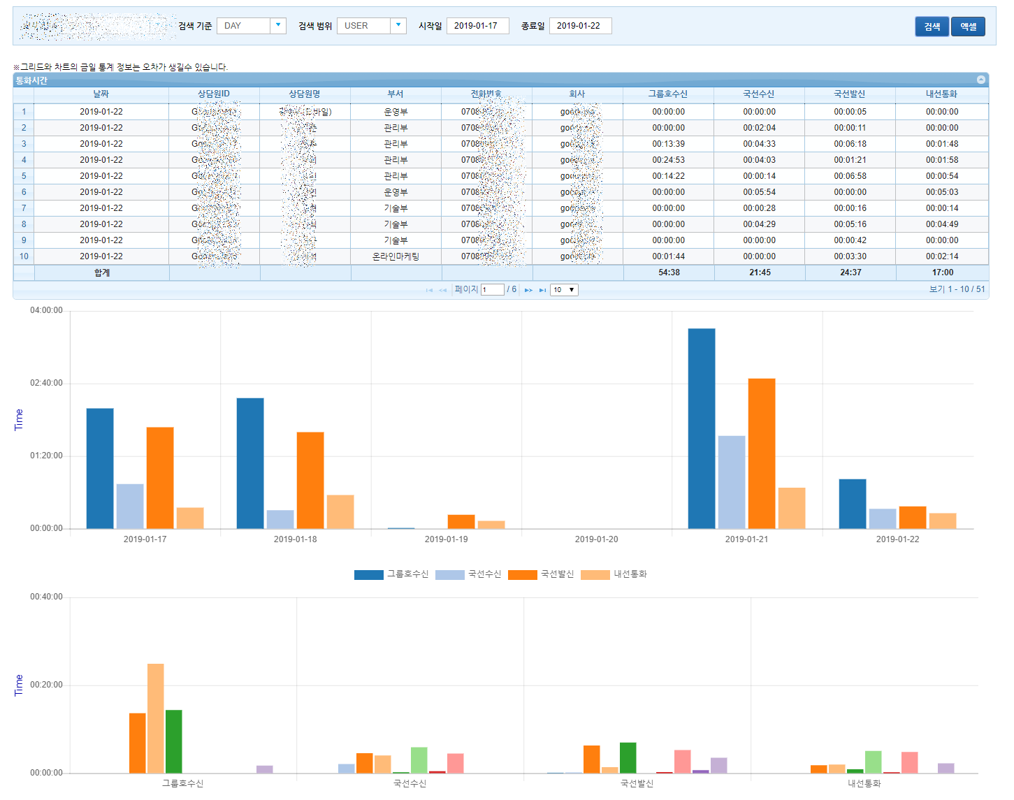 - 검색 기간동안 직원의 수신,발신,내선, 돌려주기 부분이 카운팅됩니다.