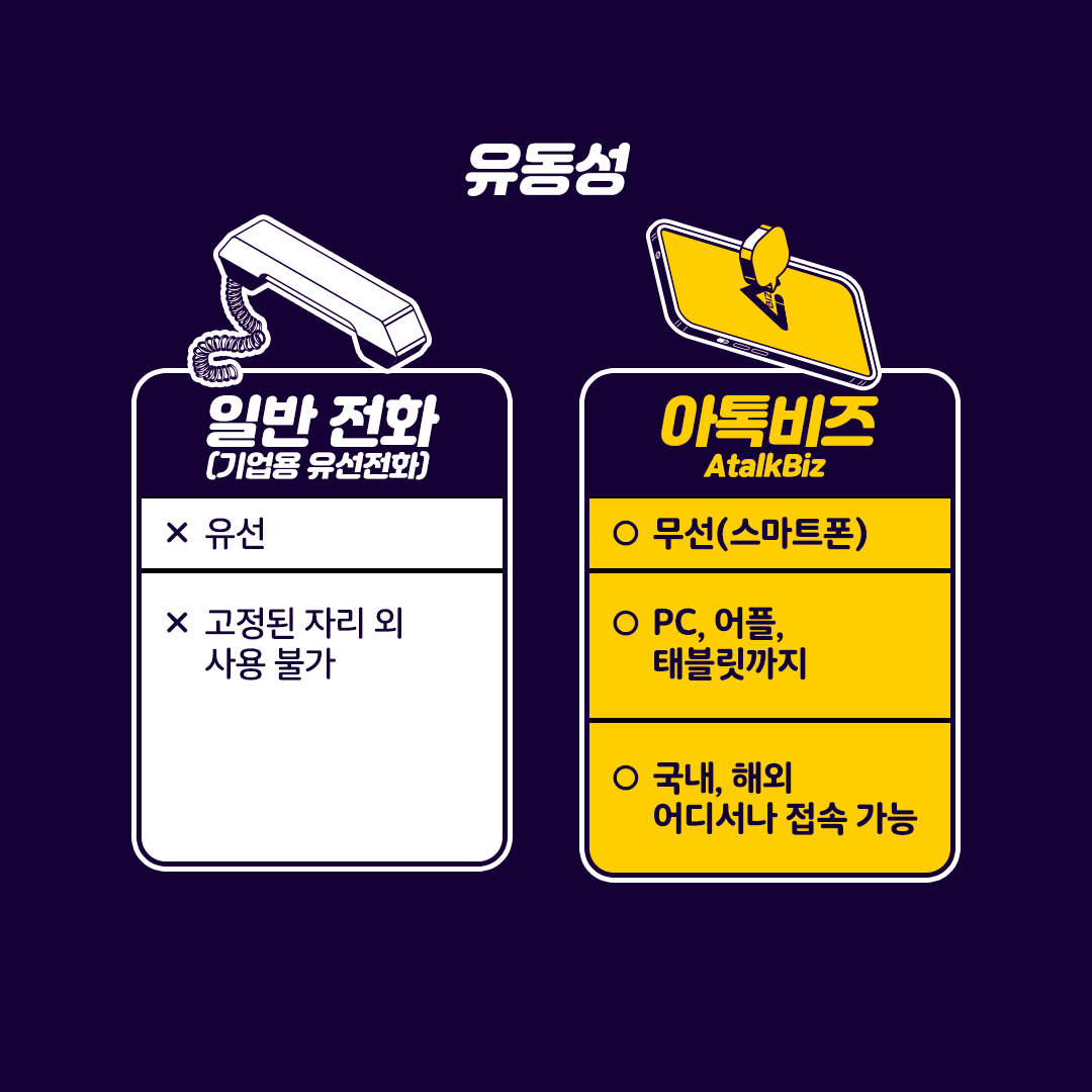 항상 고정된 자리에 있는 일반 유선 전화와 달리 언제 어디서나 업무 전화를 걸고 받을 수 있어