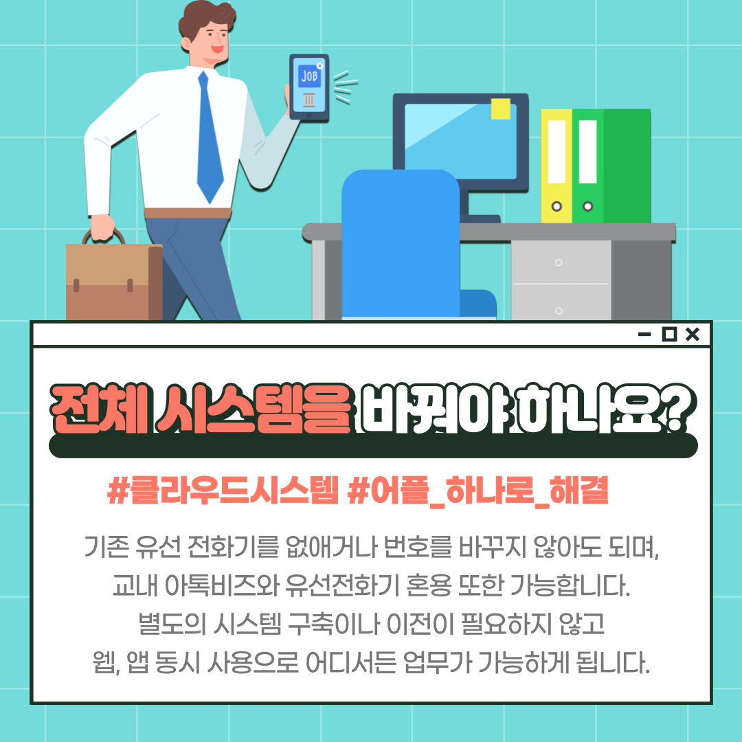 - 별도의 구축이나 이전할 필요 없이 기존의 유선 전화기와 스마트폰에서 전부 사용 가능해요.