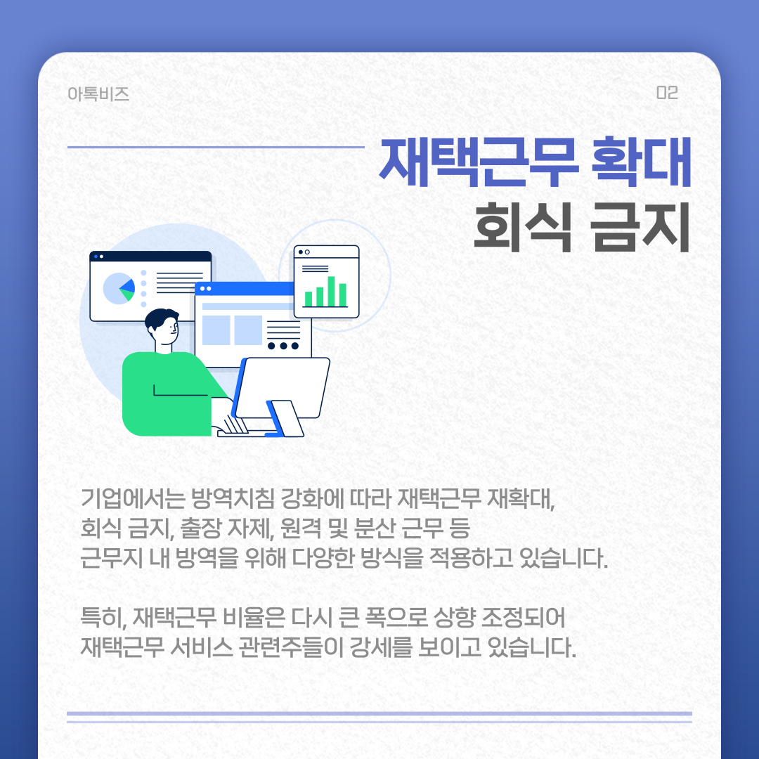 실제로 체감이 가능할 만큼 재택근무를 재시작한 기업들이 많습니다. 재택근무 형태의 업무 변화뿐만 아니라 많은 곳들이 회식을 금지하고, 출장은 제한하며 원격 및 분산 근무, 유연근무제 등의 다양한 방식을 채택하여 근무지 내 방역에 힘을 쓰고 있습니다.
