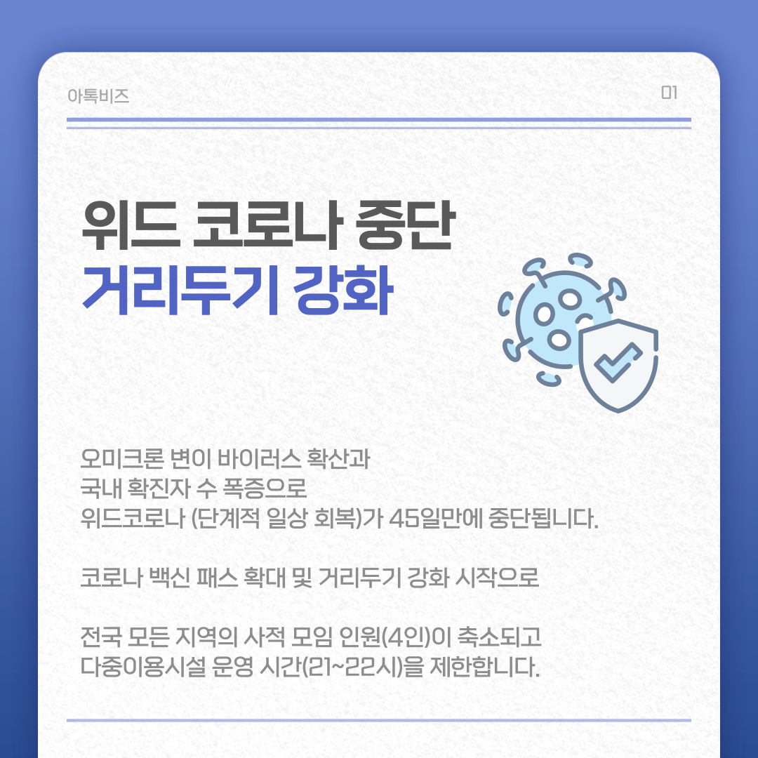 안녕하세요. 아톡비즈 서비스입니다. '위드 코로나'가 예상보다 빠른 한 달 반 만에 막을 내리고 거리두기가 강화되었습니다. 최근 1~2주 간 확진자 수가 꾸준히 늘어나자 출퇴근 시 대중교통의 혼잡도가 줄어든 것이 눈에 띄는데요.