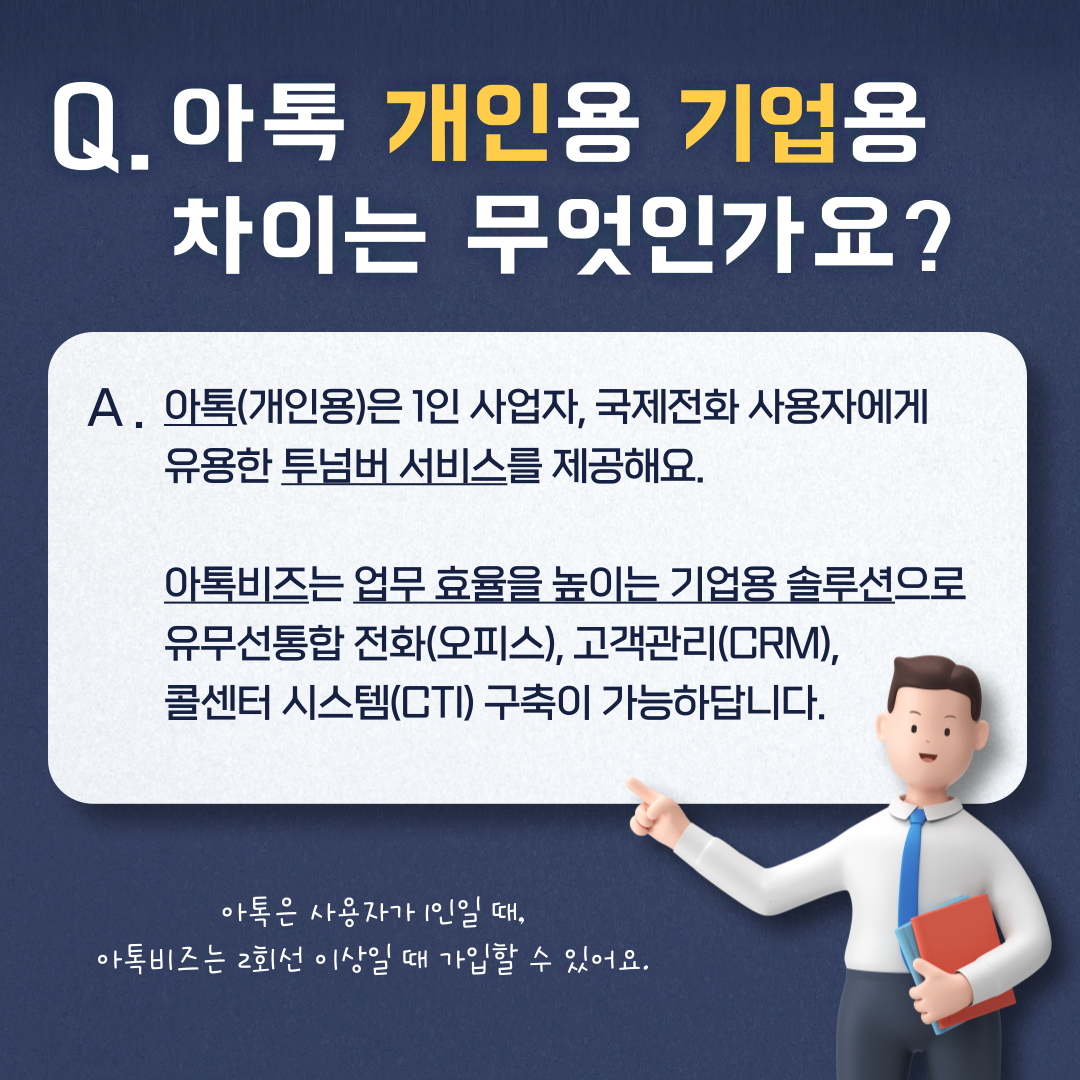 아톡은 개인용 서비스입니다. 사용자가 1인일 때 가입할 수 있으며 투넘버 서비스를 통해 1인 사업자의 CS센터 구축 또는 해외 교민과 여행객의 저렴한 국제전화가 가능하도록 제공합니다.