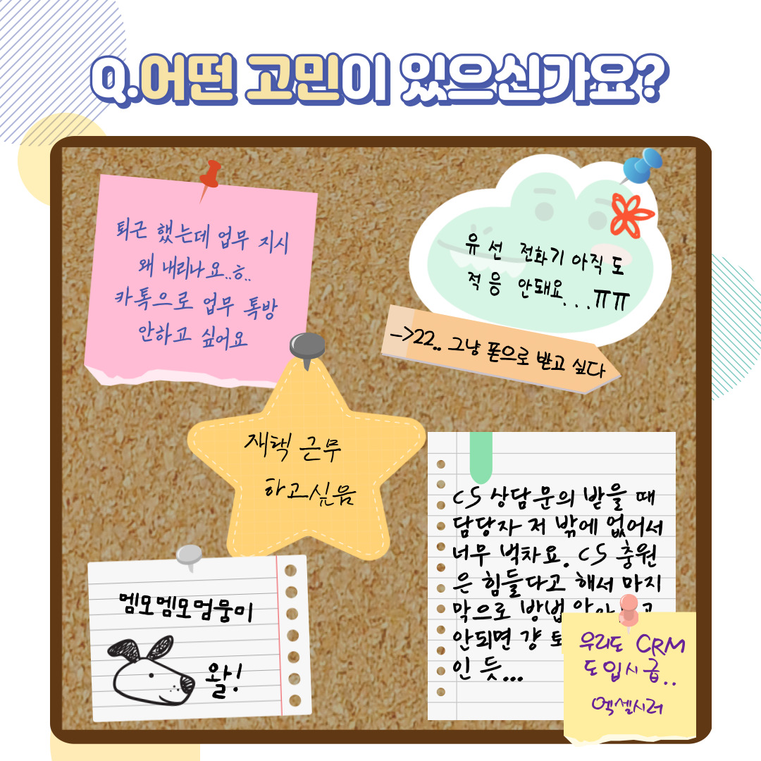 오늘 포스팅에서는 회사 생활하면서 느끼는 불편한 점과 그에 따른 고민들, 그리고 실제 문의로도 이어지는 사항들을 풀어서 소개해드릴까합니다. 다양한 고민들이 혼재하는 업무 환경에서, 아톡비즈 서비스가 맞춤으로 어떻게 도움이 될 수있을까요?