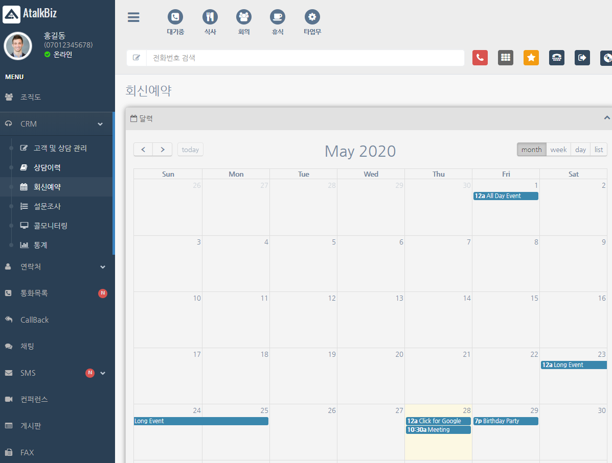 CRM : 고객관리를 할 수 있습니다. 상담이력 확인 예약문자 등을 이용할 수 있습니다.