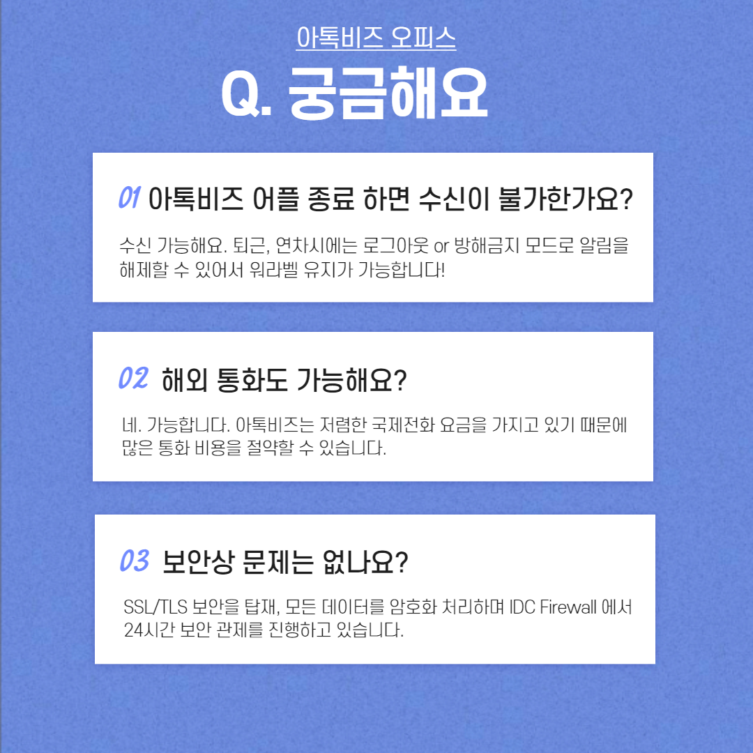 | Q. 회사 업무툴로 전화 못하나요? A. 아톡비즈: "가능" (1) | 2022.04.04 |