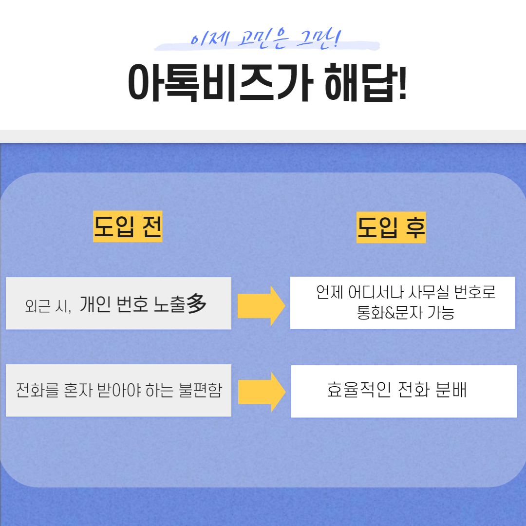 외근, 출장, 재택근무 등으로 인해 회사 외의 공간에서 통화 시 직원간, 또는 업체에게 개인번호가 쉽게 알려지게 되는데요. 그동안 이러한 개인번호 노출이 꺼려지고 불편하지 않으셨나요?
