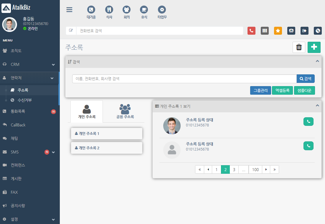 연락처 화면에서 개인 주소록/ 공용 주소록을 간편하게 업로드 후 PC에서 발신을 하실 수 있습니다.