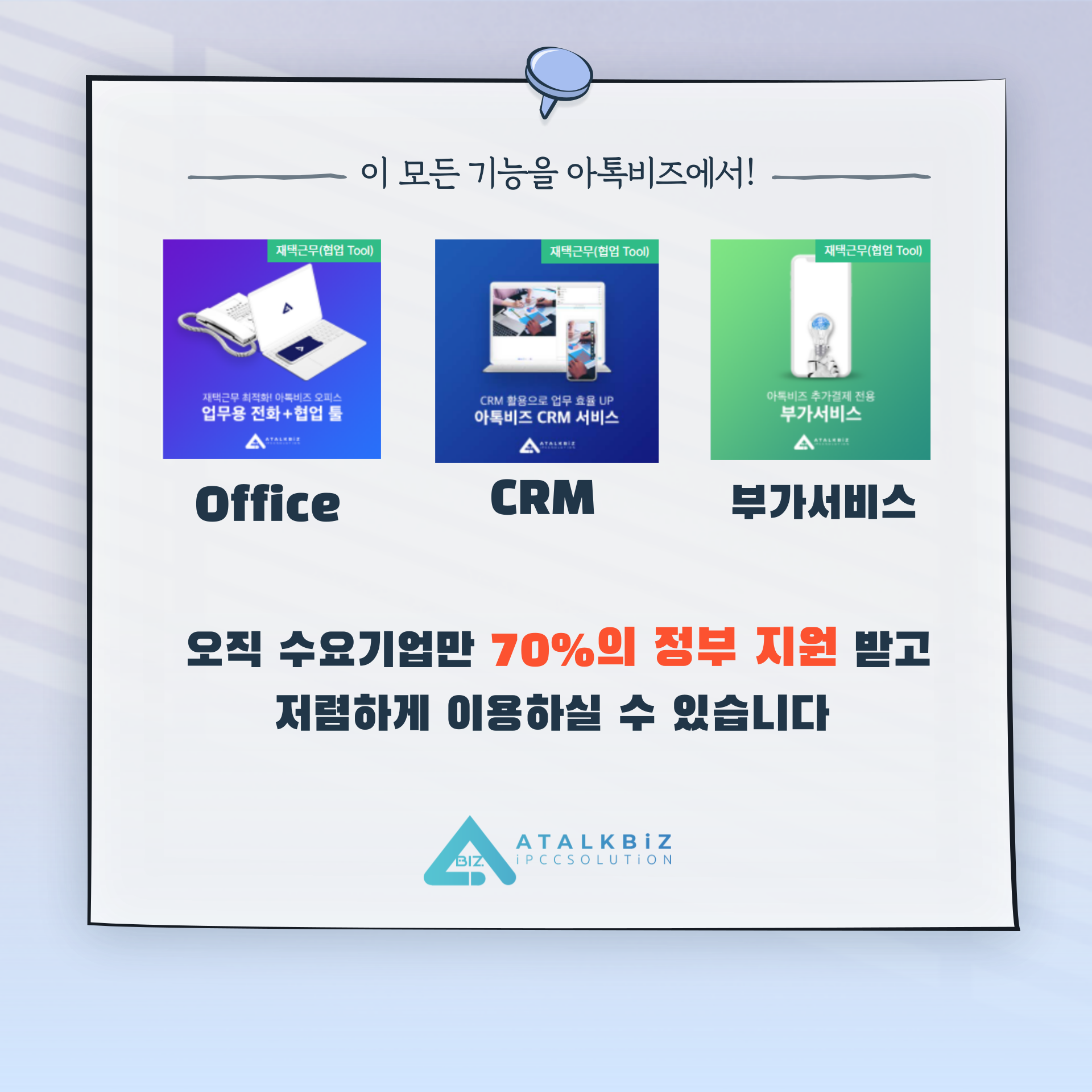 단순히 회사 메신저로만 소통을 하기에는 업무에 지장이 생기고, 그렇다고 필요한 프로그램들을 구입하자니 서비스 비교에 비용에 여러 문제들이 있는데 비대면 바우처 공급기업인 아톡비즈에서 협업 툴 전부 해결해보세요!