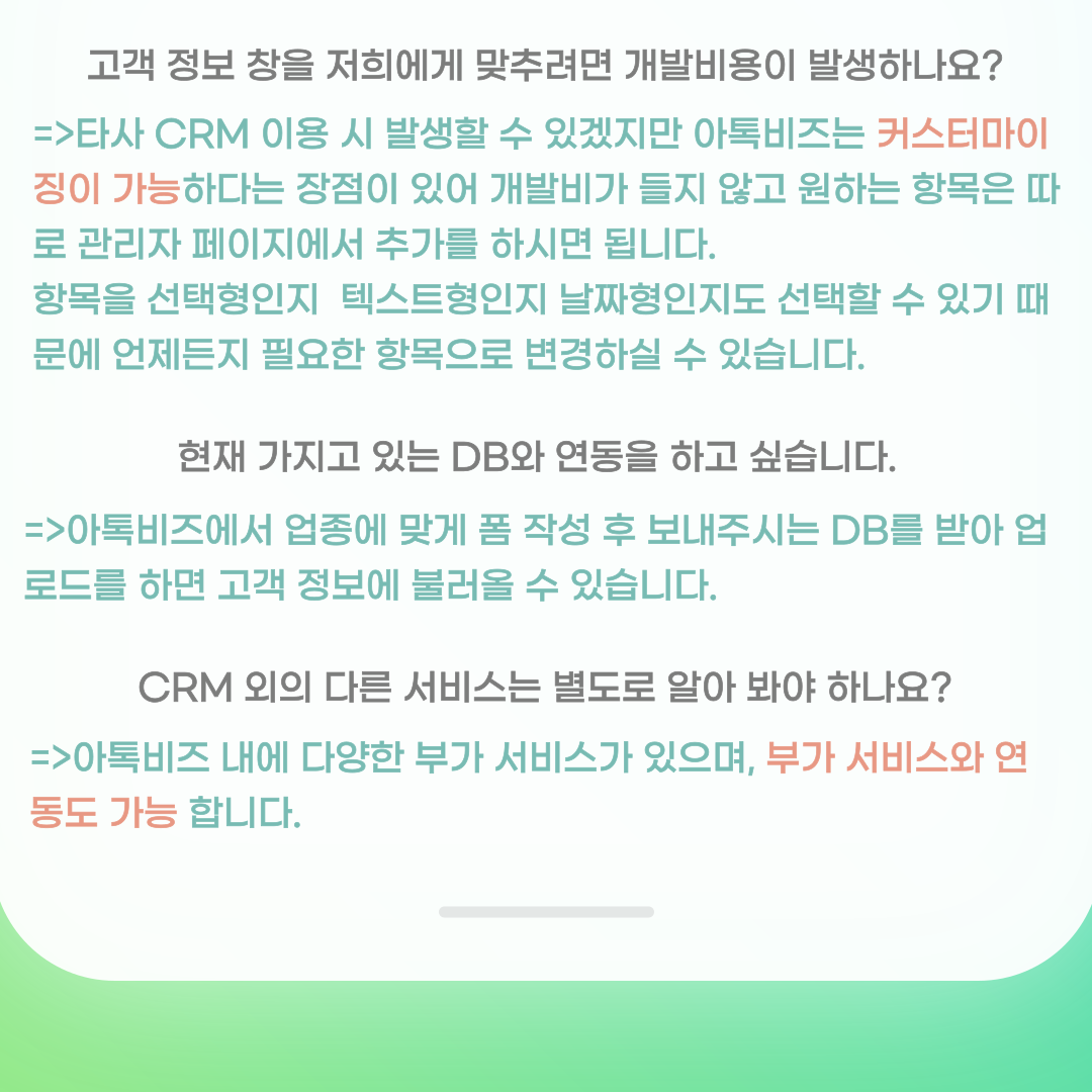 =>타사 CRM 이용 시 발생할 수 있겠지만 아톡비즈는  커스터마이징이 가능하다는 장점이 있기 때문에 개발비가 들지 않고 원하는 항목은 따로 관리자 페이지에서 추가를 하시면 됩니다. 항목을 선택형인지 텍스트형인지 날짜형인지도 선택할 수 있기 때문에 언제든지 필요한 항목으로 변경하실 수 있습니다.