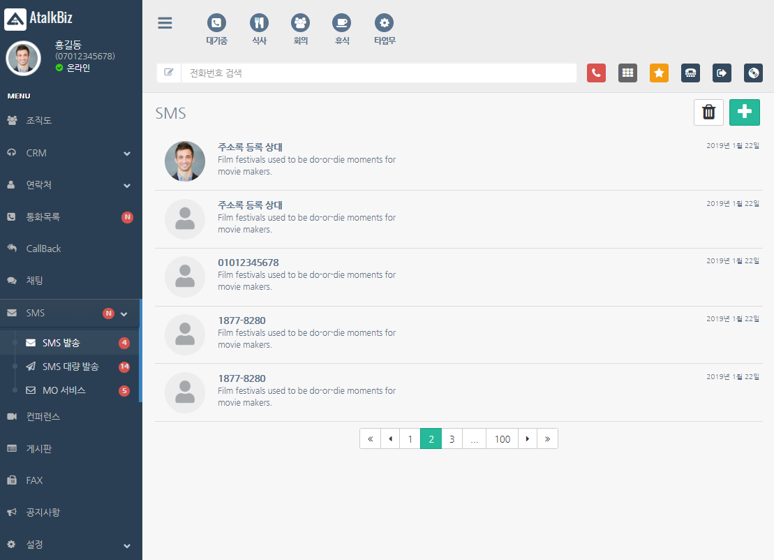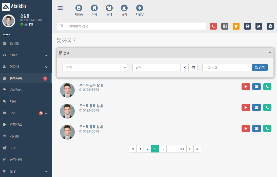 아톡비즈 서비스를 이용하시면 고객님의 PC에서 통화했던 고객과의 통화내역 확인과 문자발송 및 녹취된 통화내용을 확인할 수 있습니다. 클라우드 시스템의 활용으로 PC와 핸드폰에서 기업에 필요한 사무실전화기능을 간편하게 이용해보세요.