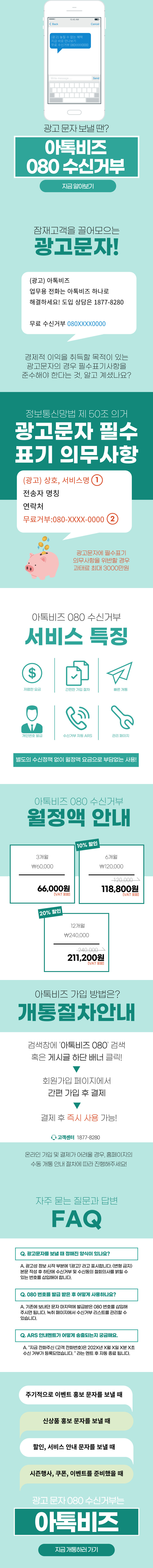 아톡비즈 080 수신거부번호 서비스는 추가 수신료 정책 없이 월정액제 개별 번호로 부담없는 사용이 가능합니다.