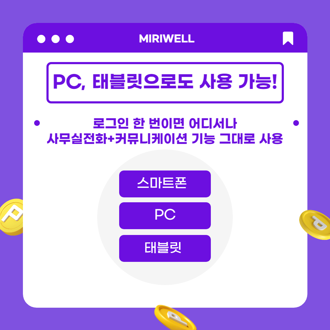 스마트폰 외에도 PC, 태블릿으로도 사무실전화 + 커뮤니케이션 기능을 사용할 수 있습니다.