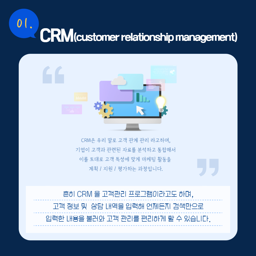상담관리 프로그램은 원래 CRM이라고도 하는데 CRM은 고객 관계 관리라고 하며, 기업이 고객과 관련된 자료를 분석하고 통합해서 이를 토대로 고객 특성에 맞게 마케팅 활동을 계획 / 지원 /평가 하는 과정이기도 합니다.