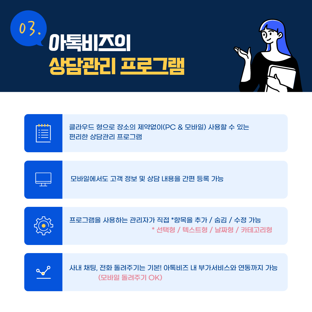 고객과 상담 관리는 이제 아톡비즈의 상담관리 프로그램(CRM)으로 해보세요.