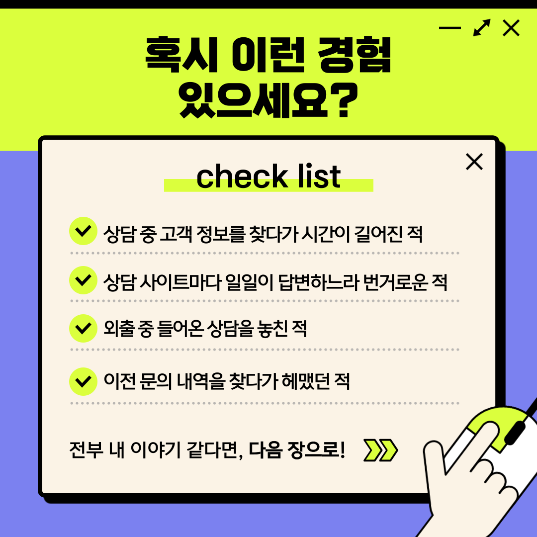 기업에서 다양한 채널들을 활용하면서 전화나 문자뿐 아니라 카카오톡, 네이버 톡톡, SNS 등 다양한 채널에서 고객 문의를 받는 경우가 많습니다. 고객상담의 중요한 점은 신속하고, 정확하게 답변하는것인데요. 여러 채널에서 상담문의가 들어오다 보면 각 채널별로 여러 창을 띄어놓아야 하고, 채널마다 왔다 갔다 복잡해져 누락되는 경우가 생길 수 있습니다.