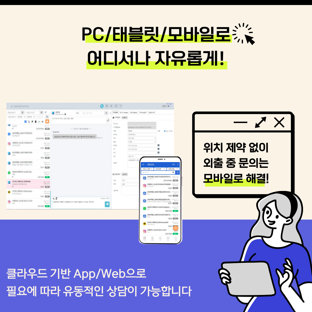 아톡비즈 통합상담은 클라우드 기반으로 인터넷이 연결된 환경이라면 PC/태블릿/모바일로 어디서나 상담 가능하여 외출 중 들어온 상담도 놓치지 않고 응대할 수 있습니다.