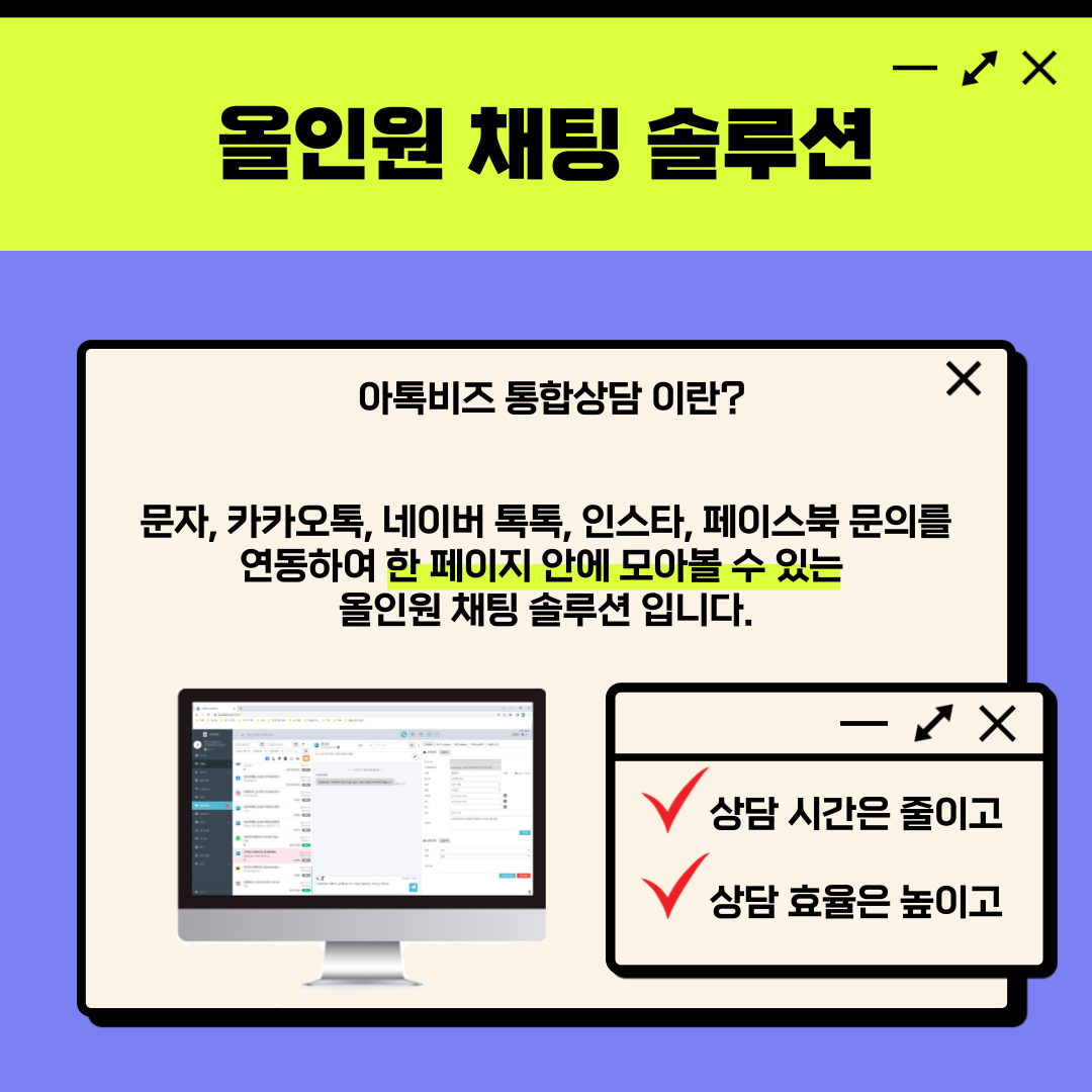 기업에서 다양한 채널들을 활용하면서 전화나 문자뿐 아니라 카카오톡, 네이버 톡톡, SNS 등 다양한 채널에서 고객 문의를 받는 경우가 많습니다. 고객상담의 중요한 점은 신속하고, 정확하게 답변하는것인데요. 여러 채널에서 상담문의가 들어오다 보면 각 채널별로 여러 창을 띄어놓아야 하고, 채널마다 왔다 갔다 복잡해져 누락되는 경우가 생길 수 있습니다.