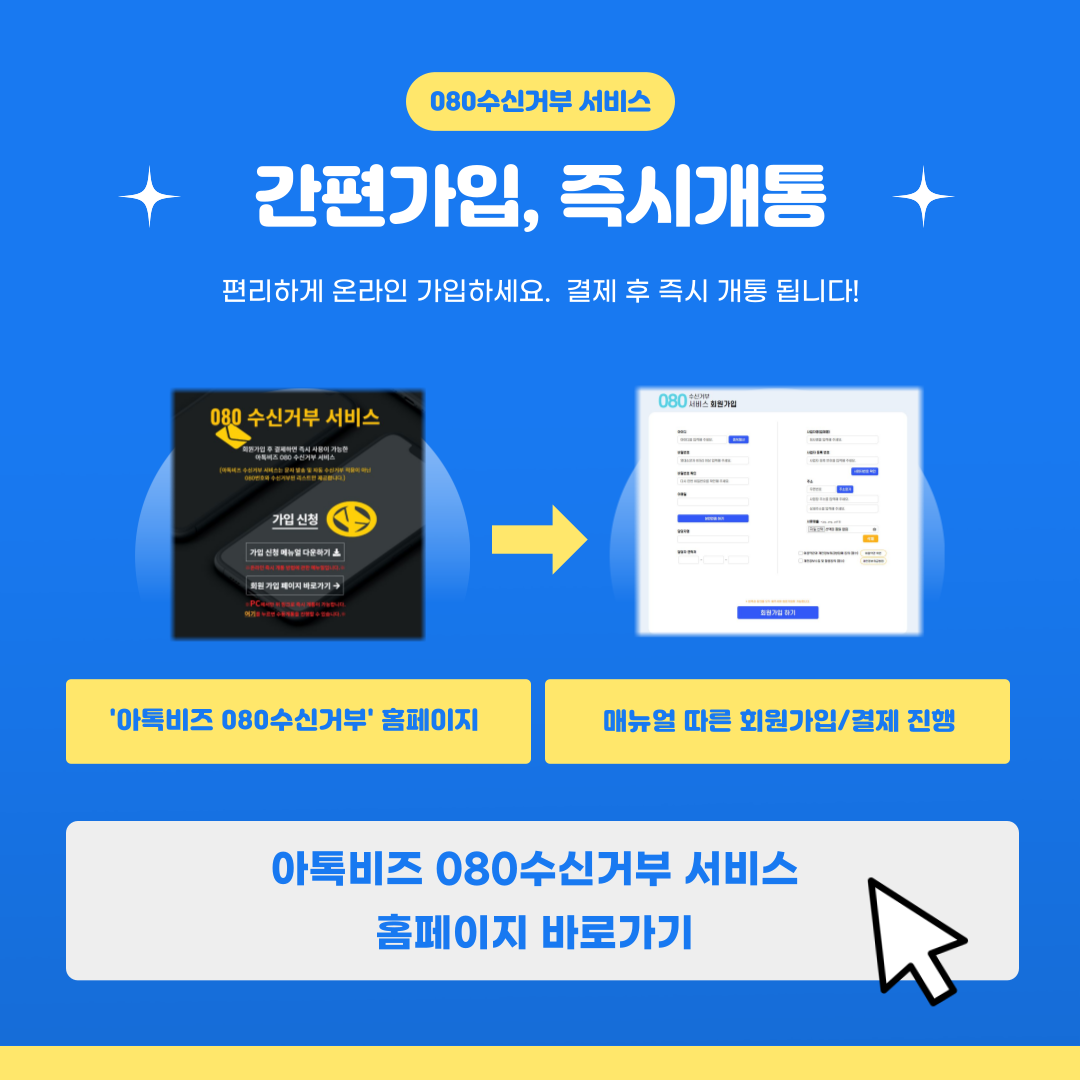 ☑️ 단독 번호가 아니라 공동으로 080번호를 사용한다면 수신거부 관리가 복잡하지만, 아톡비즈는 개별 080번호를 개통하여 단독으로 편리하게 이용하실 수 있어요.