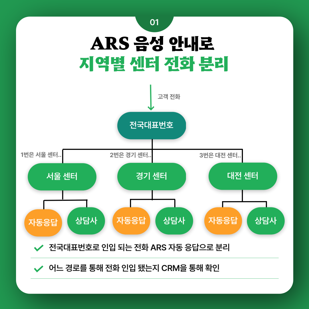 만약 고객이 대전에 있는 곳으로 전화를 했을 경우 서울에서 전화를 받을 수 있으며 CRM에서 '대전 XX센터'로 경로를 확인할 수 있습니다 :)