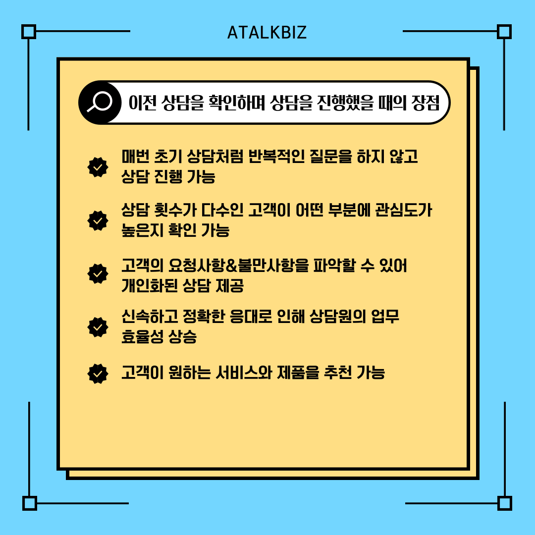 아톡비즈에서는 CRM을 도입했을 경우 기존에 저장된 고객에게 연락이 오면 자동으로 고객 정보와 상담 내용을 불러옵니다. 이때 상담 횟수가 많은 고객이더라도 모든 상담 이력과 내용을 불러올 수 있기 때문에 상담원이 CRM을 확인하며 상담을 진행할 수 있습니다.