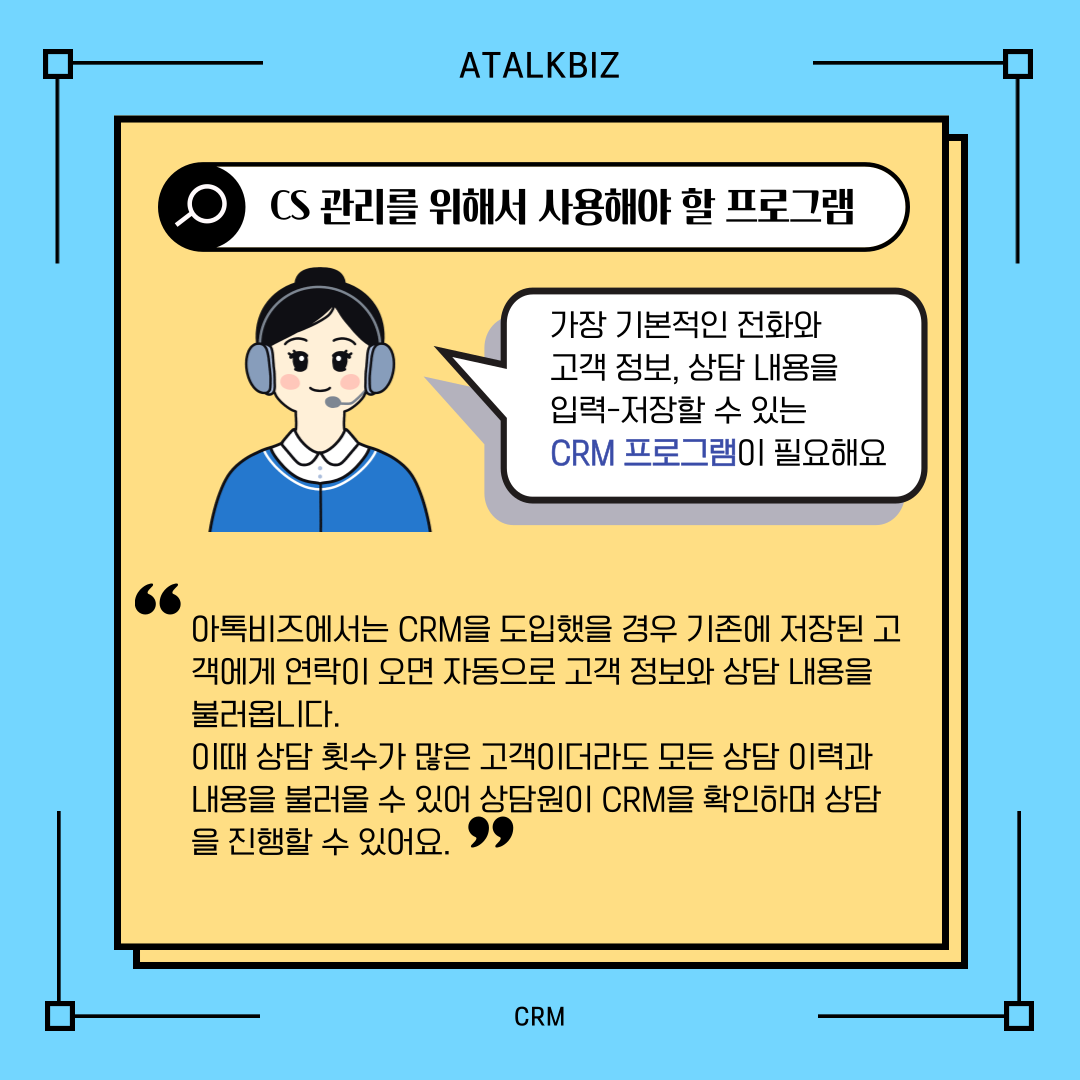 CS 관리를 위한 고객센터 프로그램으로 아톡비즈의 CRM과 통합상담을 사용해보세요.