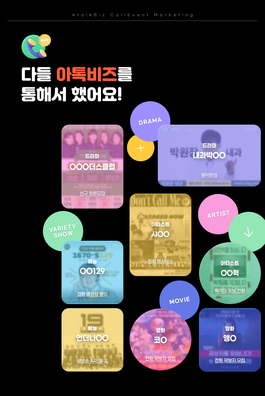 | 아톡비즈 ARS 음원송출 이벤트 엔터테인먼트 마케팅 기획 솔루션 (영화개봉, 가수, 드라마, 게임) (0) | 2023.07.10 |
