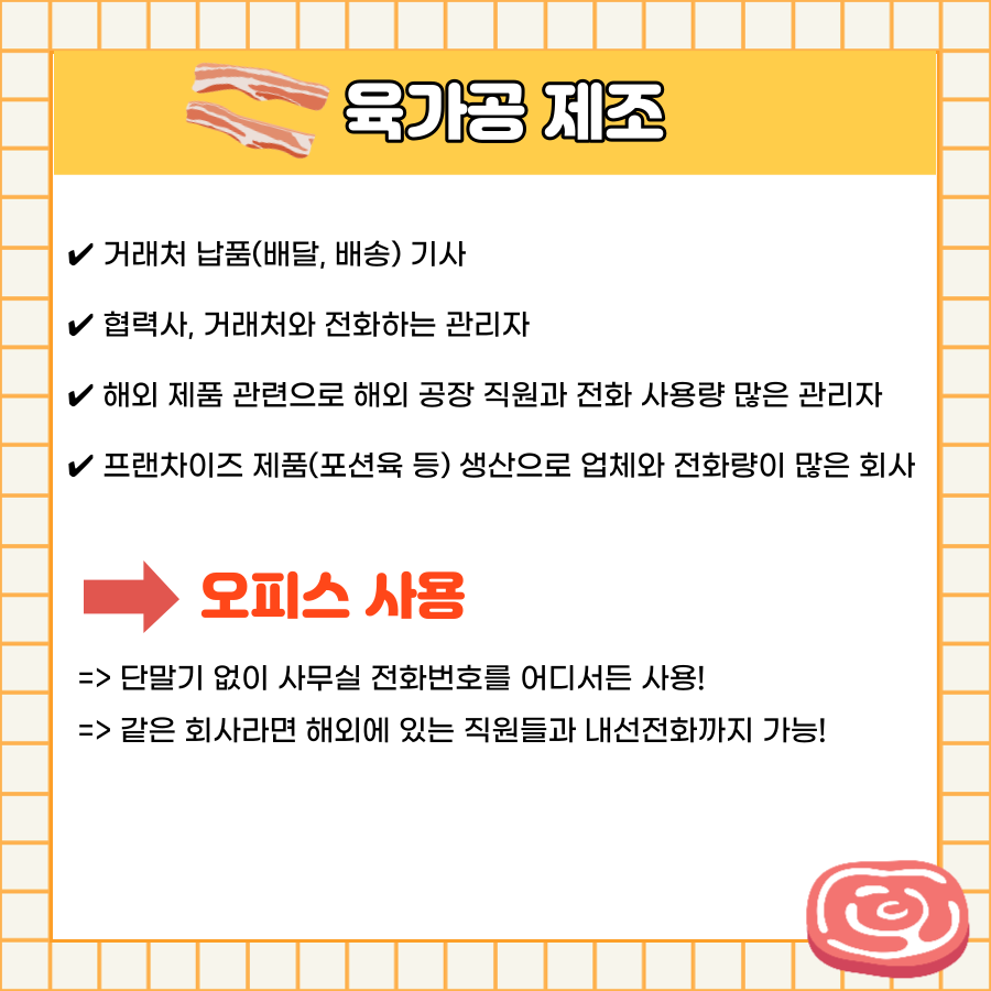 - 프랜차이즈 제품(포션육 등) 생산으로 업체와 전화량이 많은 회사