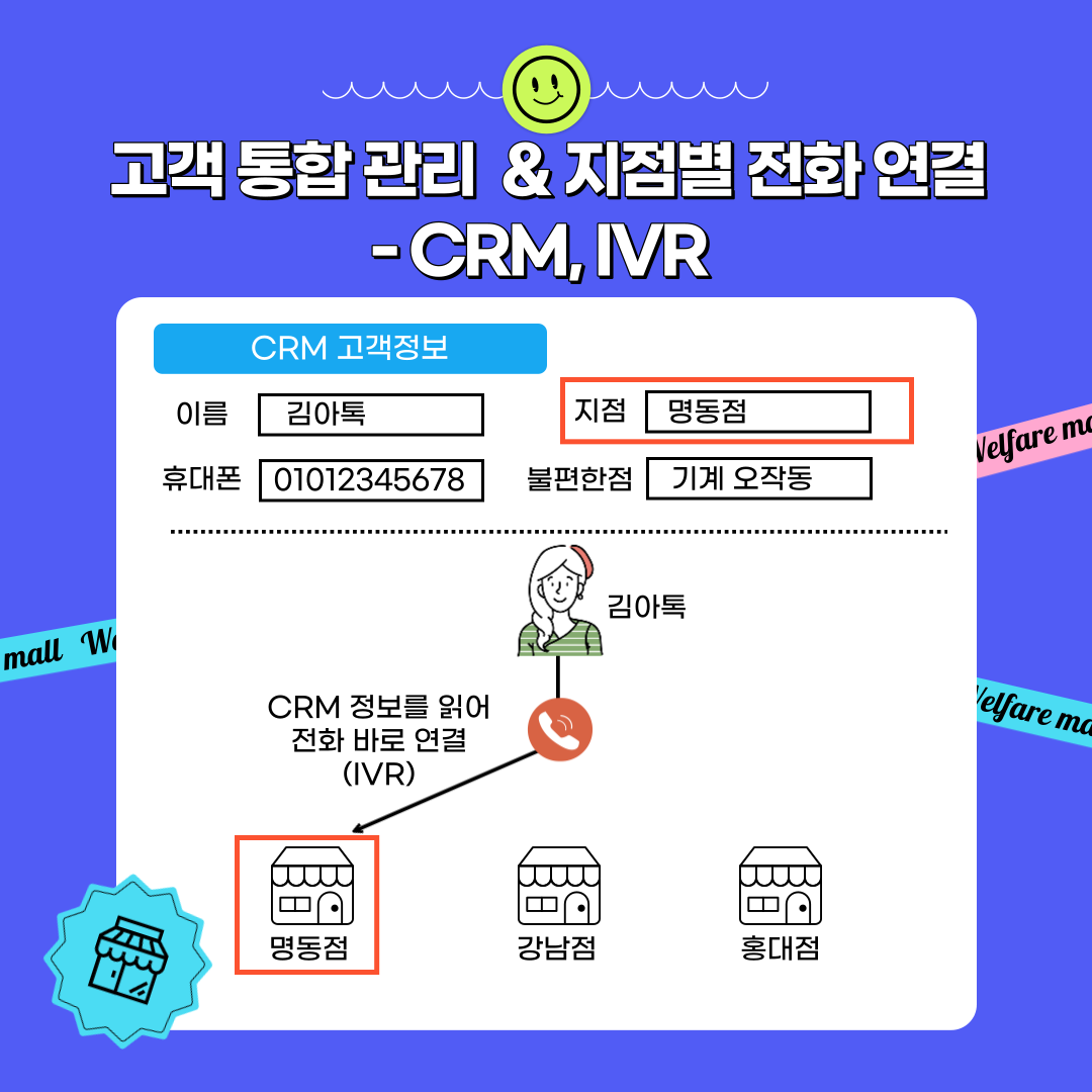 IVR 시나리오에서 '명동점'으로 CRM에 등록된 고객은 '명동점'으로 전화가 연결되도록 설정할 수 있고, 등록되지 않은 고객은(신규 고객) 고객이 지점을 선택하거나 특정 지점으로 전화가 되도록 할 수 있습니다. (전화 연결은 시나리오에 따라 다릅니다)