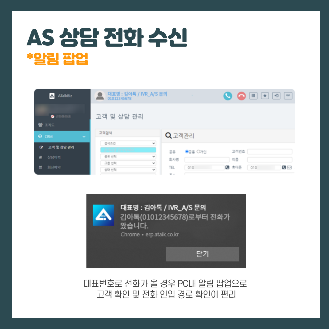 만약 상담원 콜 분배 및 전문 고객센터 프로그램이 필요하다면 아톡비즈 CTI 기능도 상담 받아보세요.