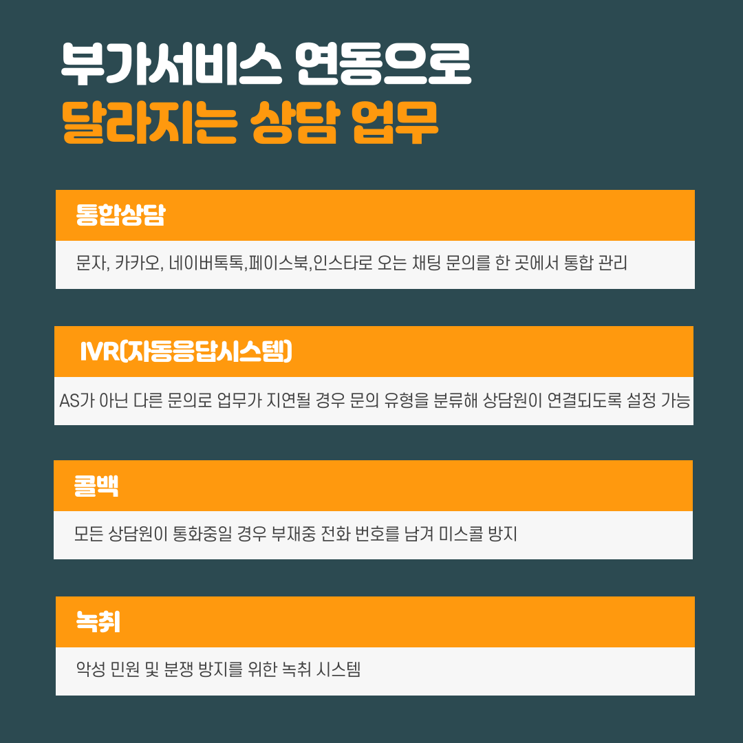 ✔ IVR -> AS가 아닌 다른 문의로 업무가 지연될 경우 문의 유형을 분류해 상담원이 연결되도록 설정 가능(자동응답시스템)