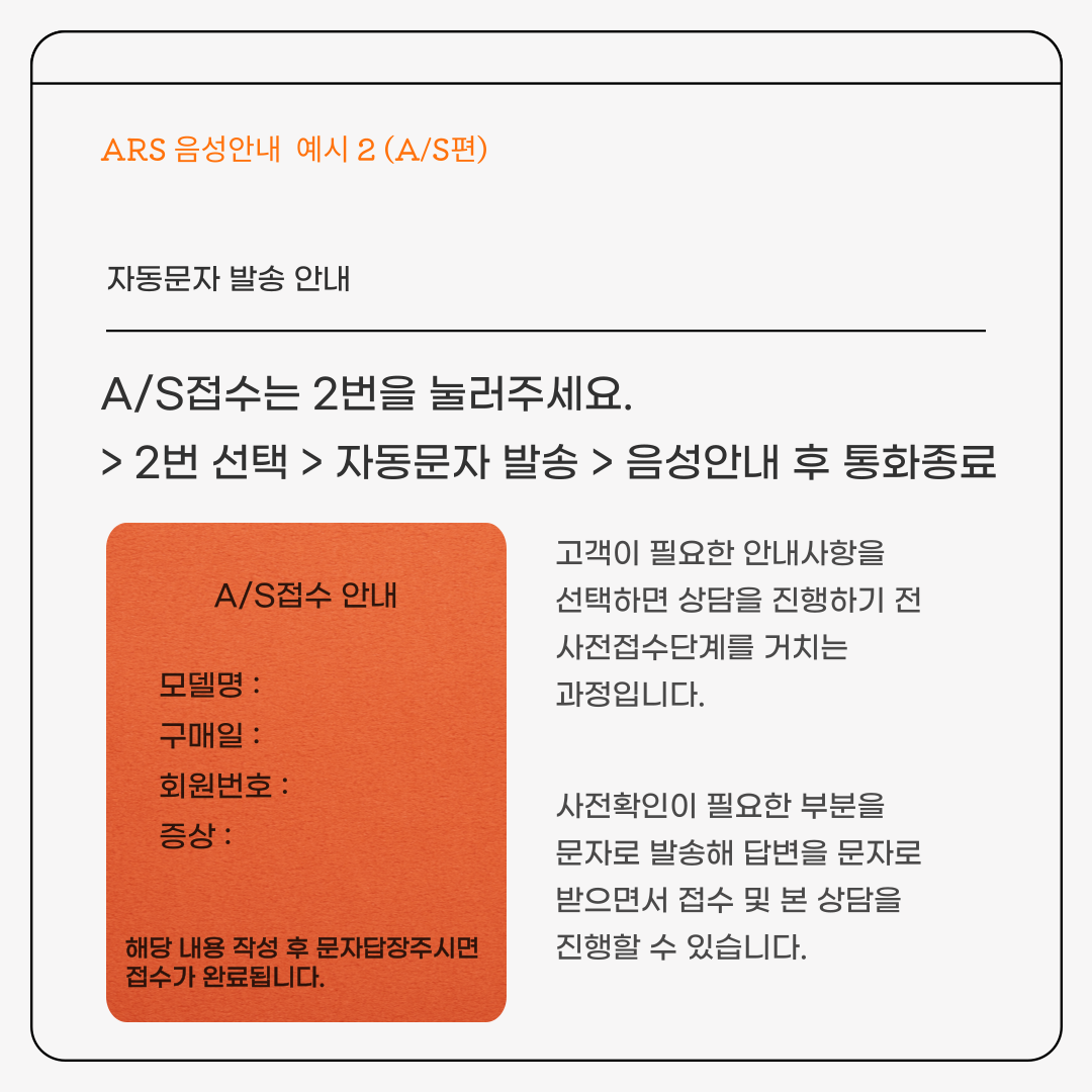 ■ 상담 전 미리 확인이 필요한 문의는 확인사항 항목을 문자나 카카오 채널톡을 발송하여 고객이 상담전에 사전내용을 작성하고 전달하게 됩니다. > 이후 상담원이 해당 내용을 확인하고 접수를 진행하며 채팅이나 아웃바운드로 추가상담을 진행하시면 됩니다.