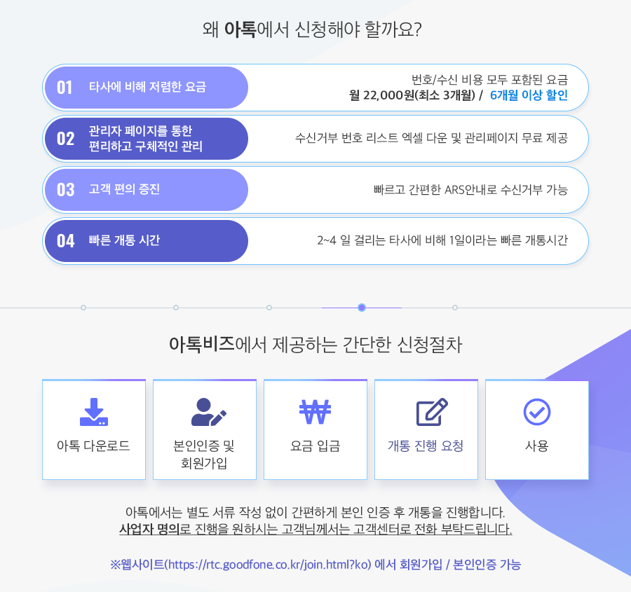 아톡에서는 고객님들의 편의를 생각하여 간단한 신청 절차로 080수신거부 서비스를 이용하실 수 있게 제작하였으며, 타사에 비해 저렴한요금과 1일이라는 빠른 개통시간을 제공해드립니다.
