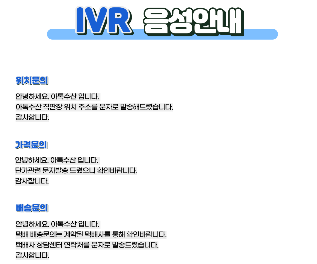 - 수산물 직판장 자동음성,문자안내 서비스로 상담원 연결없이 고객응대 완료!