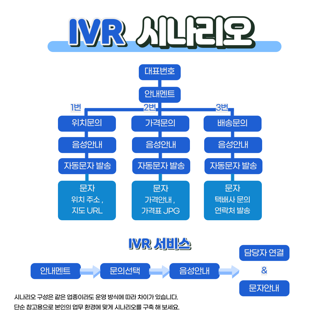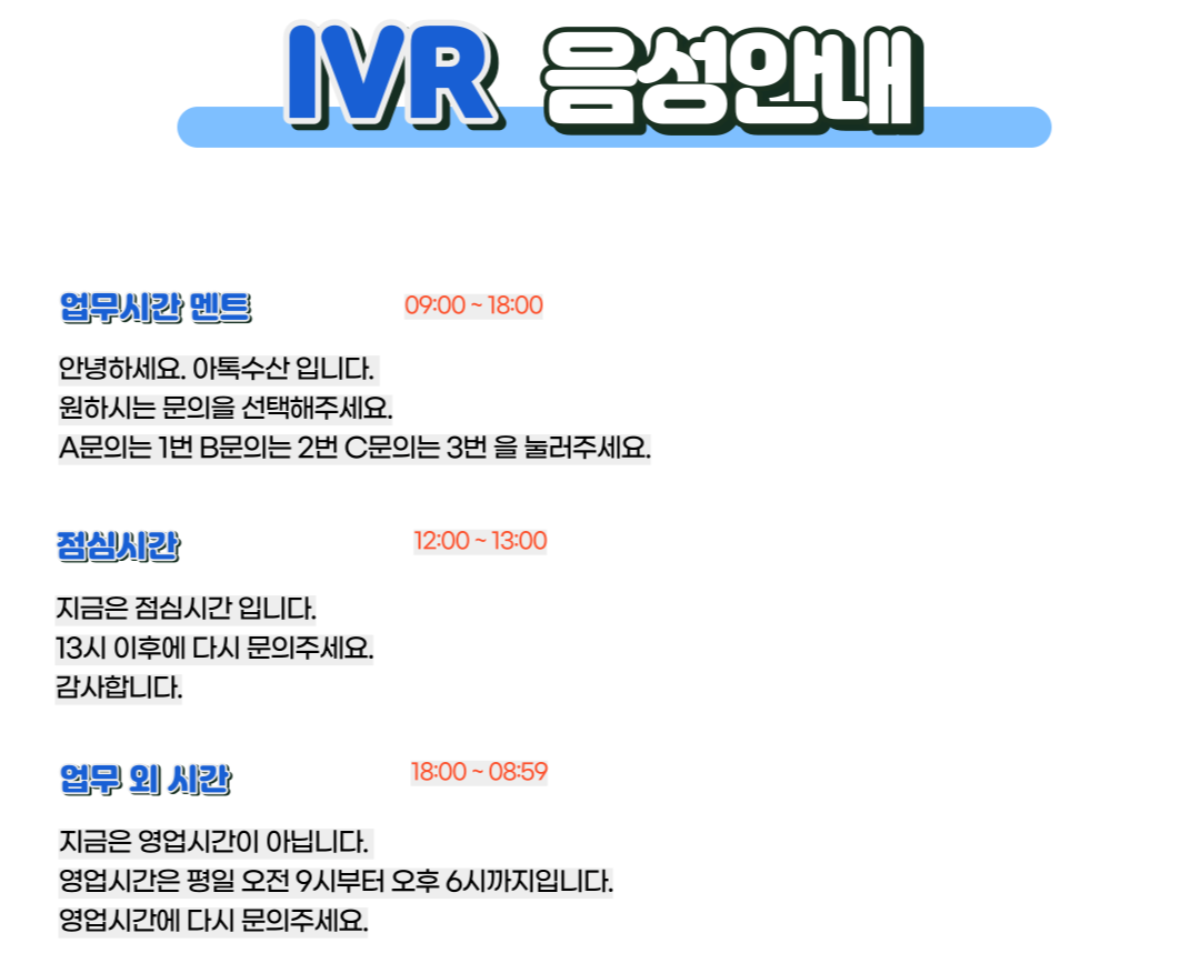- 뻔한 문의가 대부분이기 때문에 문의별 음성안내와 자동문자발송으로 고객안내를 하고싶음