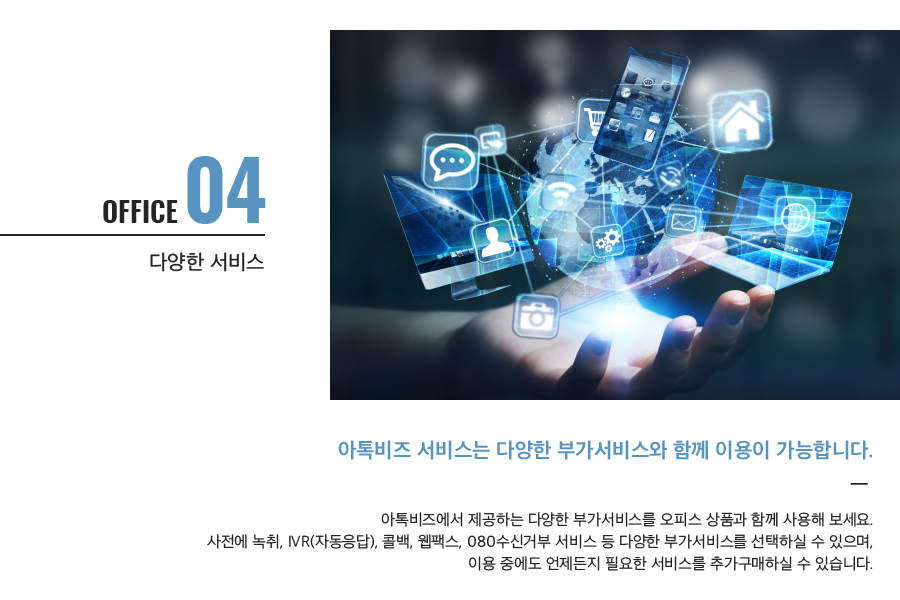 |아톡비즈 오피스 서비스에서는 전화기능 이외에 다양한 서비스를 기본으로 제공해드립니다.