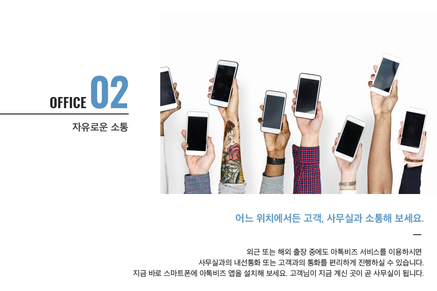 아톡비즈 서비스 이용으로 전화케이블 없는 깔끔한 스마트오피스를 구현해 보세요.