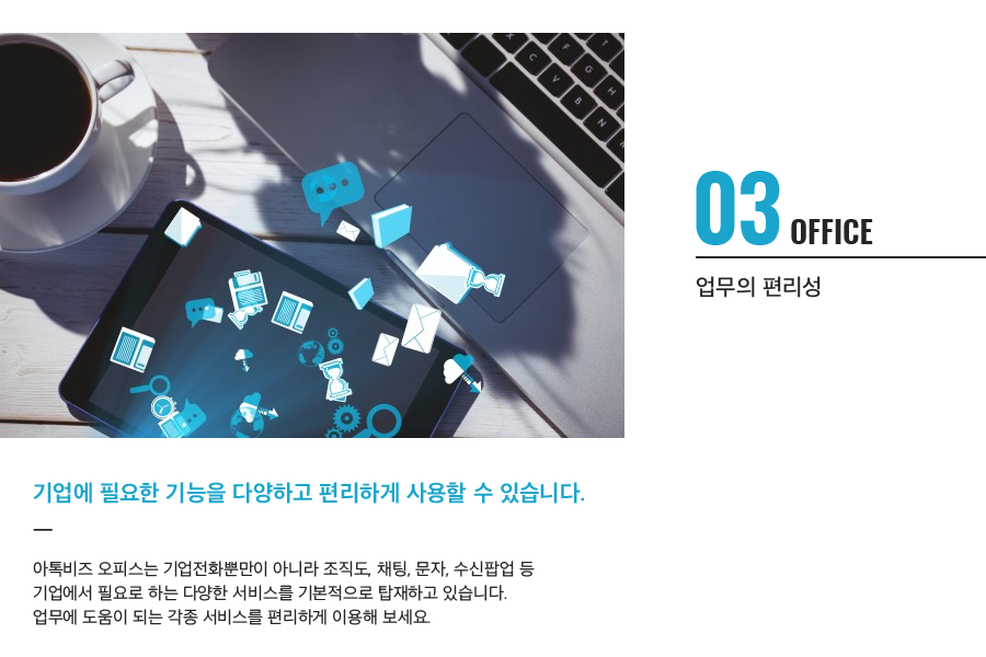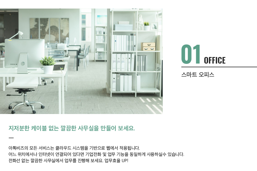 아톡비즈 서비스 이용으로 전화케이블 없는 깔끔한 스마트오피스를 구현해 보세요.