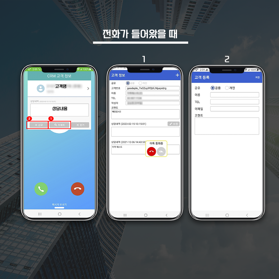 수신 시 기존 고객의 경우 고객정보를 확인할 수 있으며, 신규고객은 모바일에서 저장할 수 있는 고객관리 어플입니다.