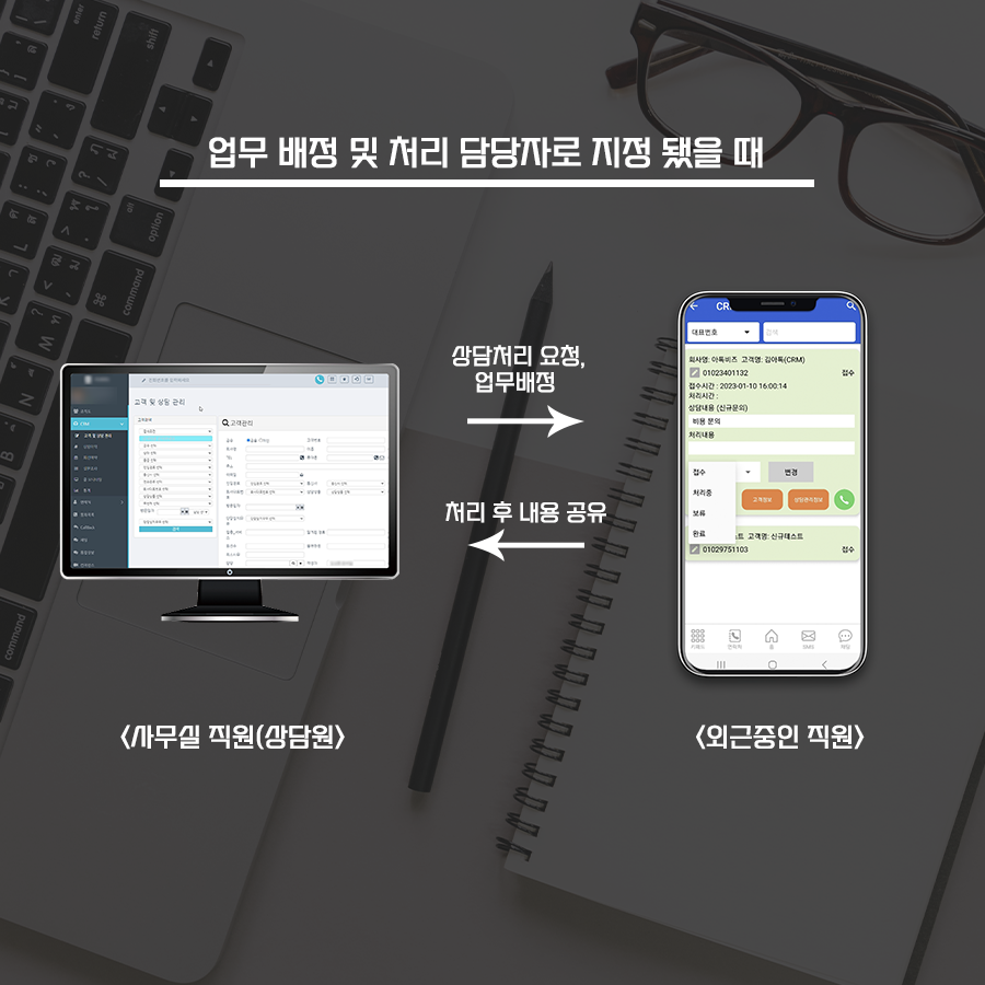 CRM 프로그램의 일부 기능이 모바일에서 되는만큼 해당 기능은 사무실 에서 프로그램을 사용하는 직원(상담원)과 공유할 수 있습니다.