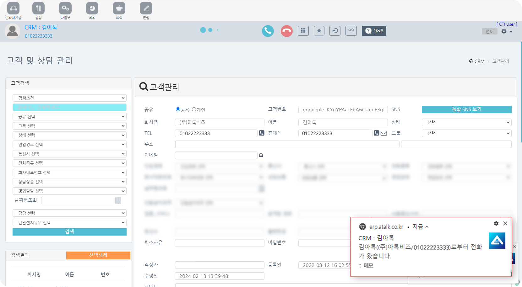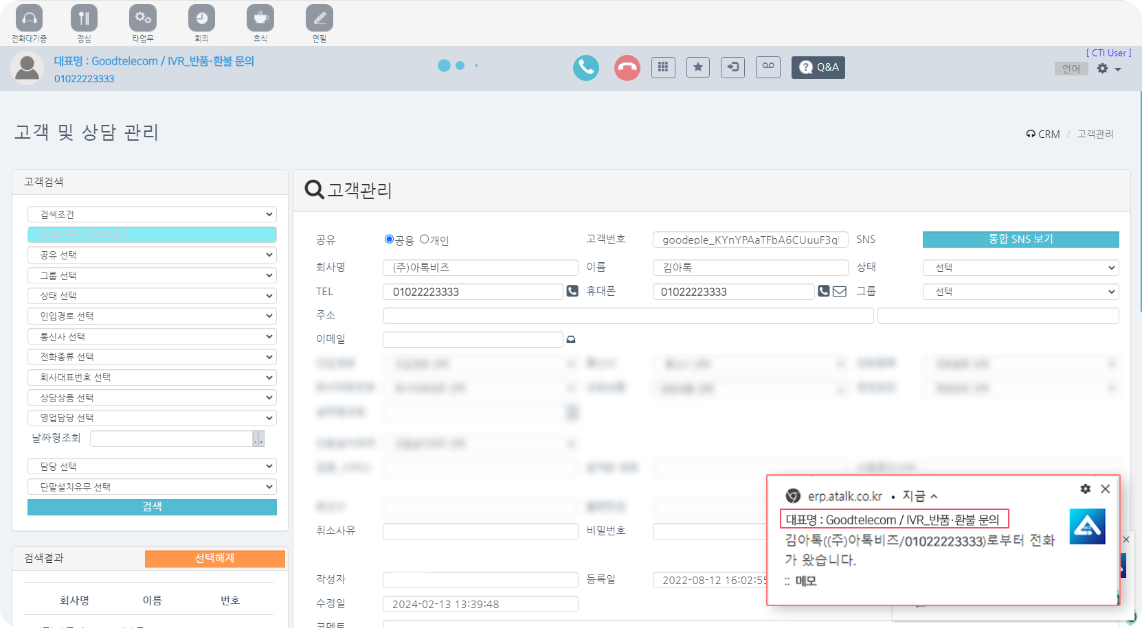 수신 시 고객/상담 정보를 PC 팝업으로 띄워주는 CRM