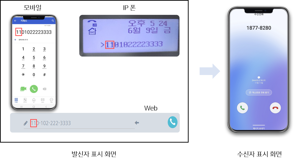 사용하시는 회사 대표번호별로 숫자로 패턴을 설정 한 뒤 해당 번호입력 후 수신자번호로 전화를 걸면