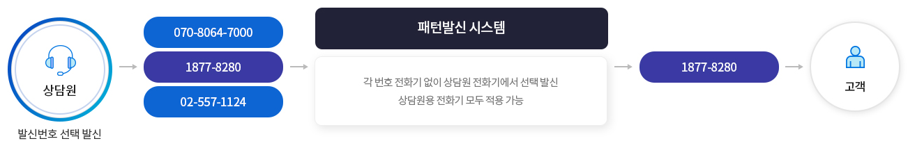 상담원이 지정된 패턴 '11'을 입력 후 상대방 전화번호로 발신을 하면 지정된 대표번호로 발신됩니다.